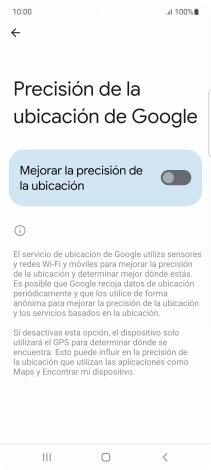 Pulsa el indicador junto a "Mejorar la precisión de la ubicación" para activar la función. Si activas la función, el teléfono podrá encontrar tu posición exacta con ayuda de los satélites GPS, la red móvil y una red wifi cercana. El GPS por satélite requiere vista libre al cielo.