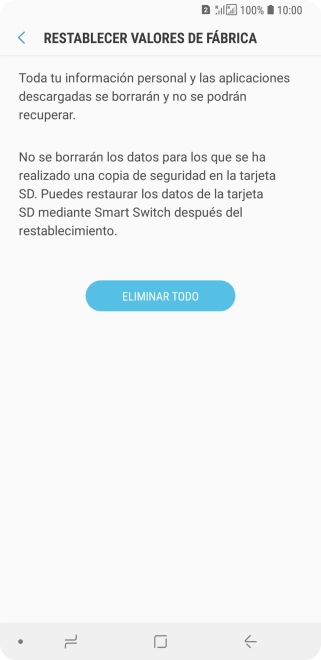 Pulsa ELIMINAR TODO. Espera unos instantes mientras el teléfono restablece la configuración predeterminada. Sigue las indicaciones de la pantalla para configurar el teléfono y dejarlo listo para su uso.