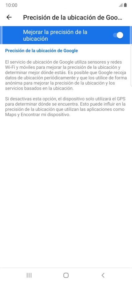 Pulsa el indicador junto a "Mejorar la precisión de la ubicación" para activar la función. Si activas la función, el teléfono podrá encontrar tu posición exacta con ayuda de los satélites GPS, la red móvil y una red wifi cercana. El GPS por satélite requiere vista libre al cielo.