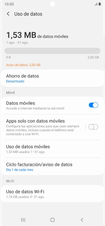 Puedes ver cuántos datos móviles has utilizado, por ejemplo, cuando has utilizado el navegador de Internet o cuando has enviado y recibido correo electrónico.