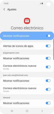 Pulsa el indicador junto a "Mostrar notificaciones" bajo la cuenta de correo electrónico deseada para activar o desactivar la función.