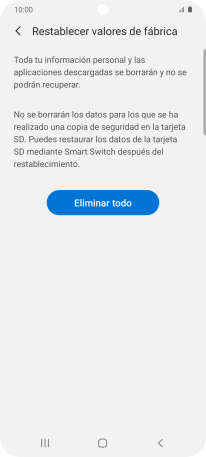 Pulsa Eliminar todo. Espera unos instantes mientras el teléfono restablece la configuración predeterminada. Sigue las indicaciones de la pantalla para configurar el teléfono y dejarlo listo para su uso.