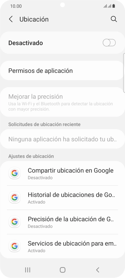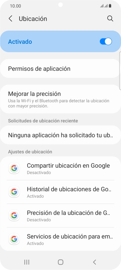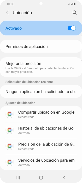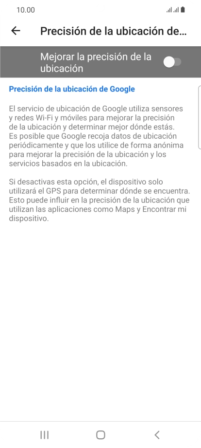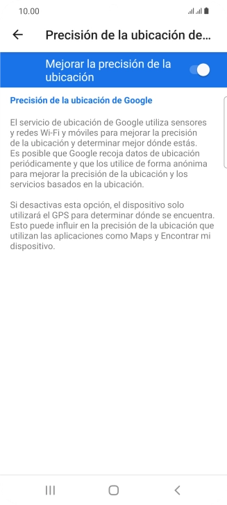 Pulsa el indicador junto a "Mejorar la precisión de la ubicación" para activar la función. Si activas la función, el teléfono podrá encontrar tu posición exacta con ayuda de los satélites GPS, la red móvil y una red Wi-Fi cercana. El GPS por satélite requiere vista libre al cielo.