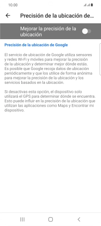 Pulsa el indicador junto a "Mejorar la precisión de la ubicación" para desactivar la función. Si desactivas la función, el teléfono podrá encontrar tu posición exacta con ayuda de los satélites GPS, pero le llevará más tiempo ya que no tiene acceso a informaciones complementarias de la red móvil o una red Wi-Fi cercana.