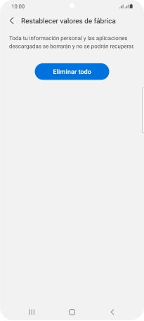 Pulsa Eliminar todo. Espera unos instantes mientras el teléfono restablece la configuración predeterminada. Sigue las indicaciones de la pantalla para configurar el teléfono y dejarlo listo para su uso.