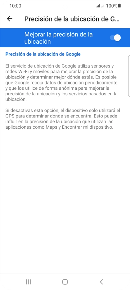Pulsa el indicador junto a "Mejorar la precisión de la ubicación" para activar la función. Si activas la función, el teléfono podrá encontrar tu posición exacta con ayuda de los satélites GPS, la red móvil y una red wifi cercana. El GPS por satélite requiere vista libre al cielo.