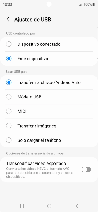 2. Selecciona el ajuste de la conexión USB