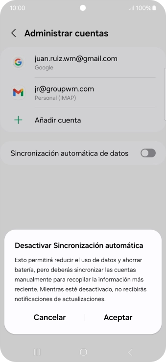 Pulsa el indicador junto a "Sincronización automática de datos" para activar o desactivar la función.