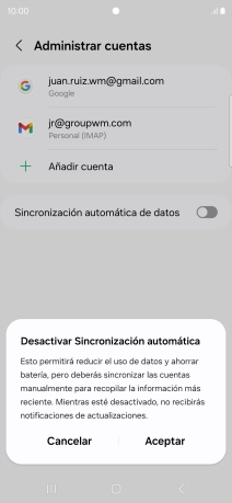 Pulsa el indicador junto a "Sincronización automática de datos" para activar o desactivar la función.