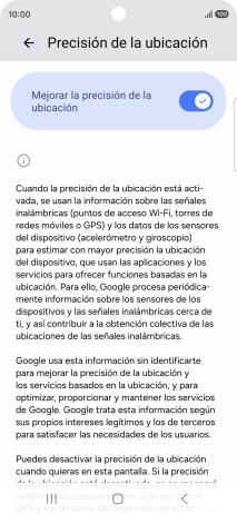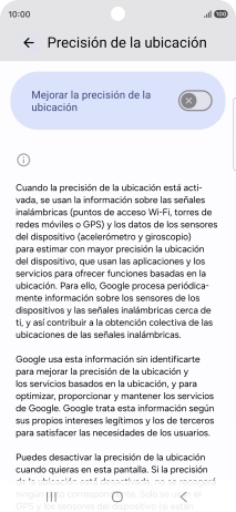 Si pulsas el indicador junto a "Mejorar la precisión de la ubicación" para desactivar la función, el teléfono podrá encontrar tu posición exacta con ayuda de los satélites GPS, pero le llevará más tiempo ya que no tiene acceso a informaciones complementarias de la red móvil o una red wifi cercana.