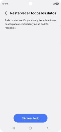 Pulsa Eliminar todo. Espera unos instantes mientras el teléfono restablece la configuración predeterminada. Sigue las indicaciones de la pantalla para configurar el teléfono y dejarlo listo para su uso.