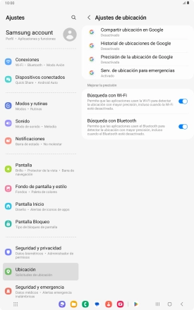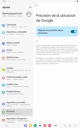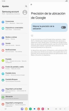 Si pulsas el indicador junto a "Mejorar la precisión de la ubicación" para desactivar la función, la tablet podrá encontrar tu posición exacta con ayuda de los satélites GPS, pero le llevará más tiempo ya que no tiene acceso a informaciones complementarias de la red móvil o una red wifi cercana.