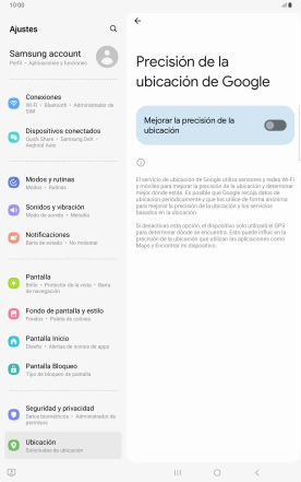 Si pulsas el indicador junto a "Mejorar la precisión de la ubicación" para desactivar la función, la tablet podrá encontrar tu posición exacta con ayuda de los satélites GPS, pero le llevará más tiempo ya que no tiene acceso a informaciones complementarias de la red móvil o una red wifi cercana.