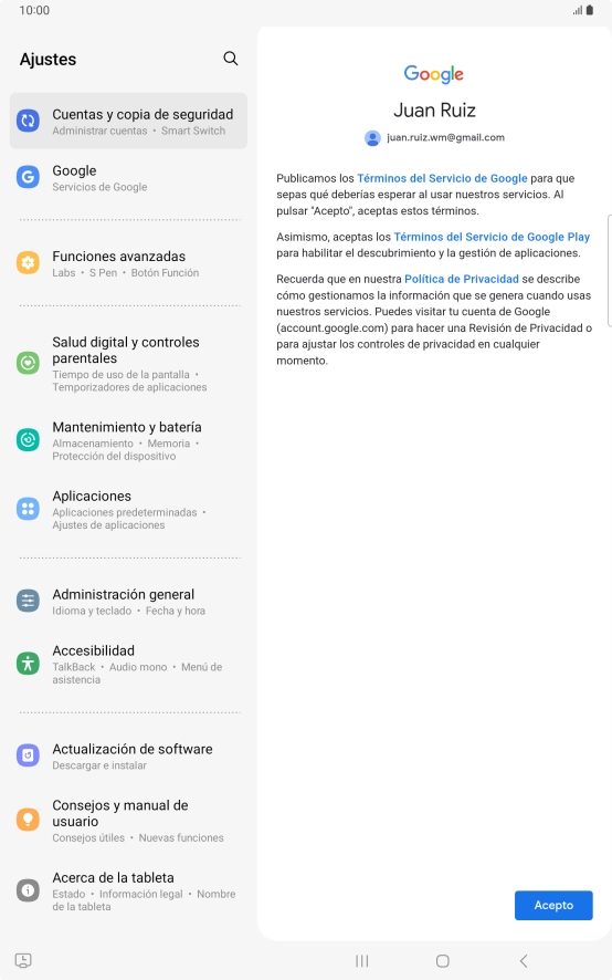 Pulsa Acepto y sigue las indicaciones de la pantalla para seleccionar los ajustes de tu cuenta de Google.
