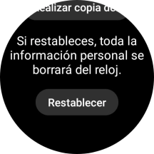 Pulsa Restablecer. Espera unos instantes mientras el smartwatch restablece la configuración predeterminada. Sigue las indicaciones de la pantalla para configurar el smartwatch y dejarlo listo para su uso.