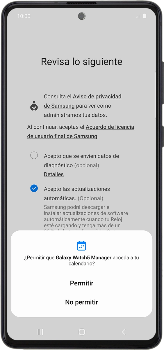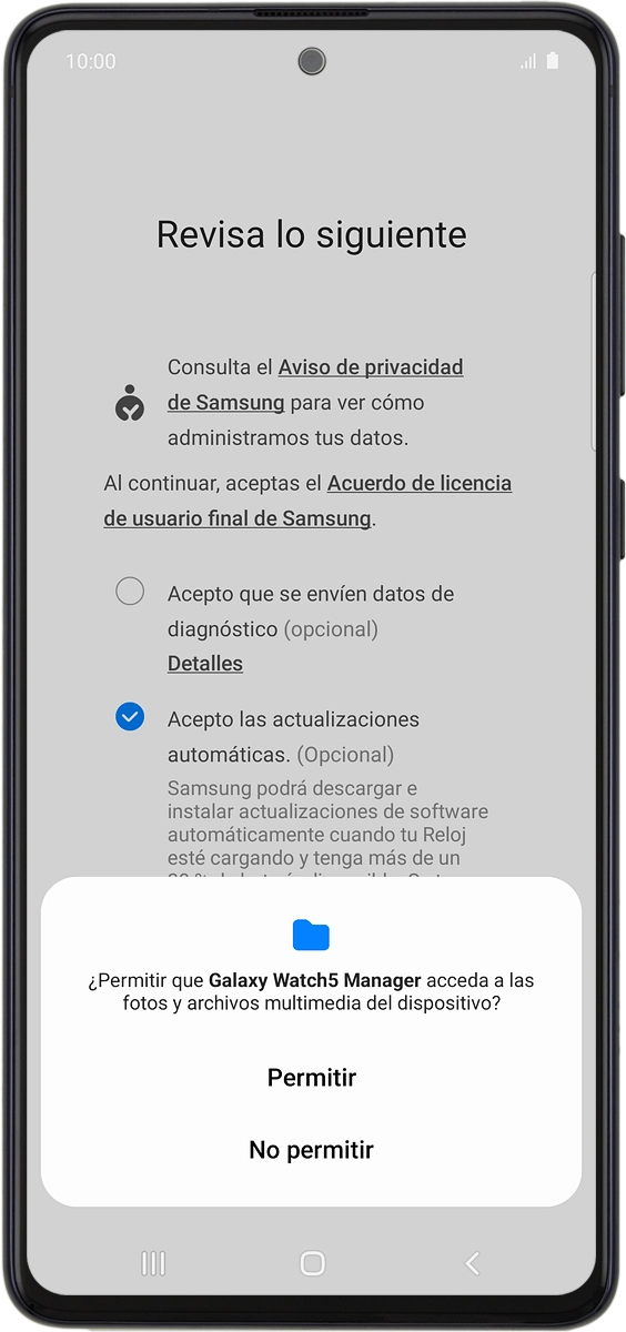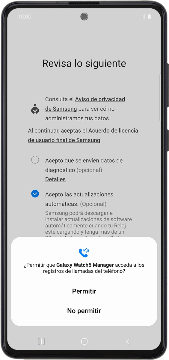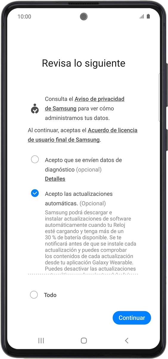 En el teléfono: Sigue las indicaciones de la pantalla para seleccionar los ajustes deseados y pulsa Continuar.
