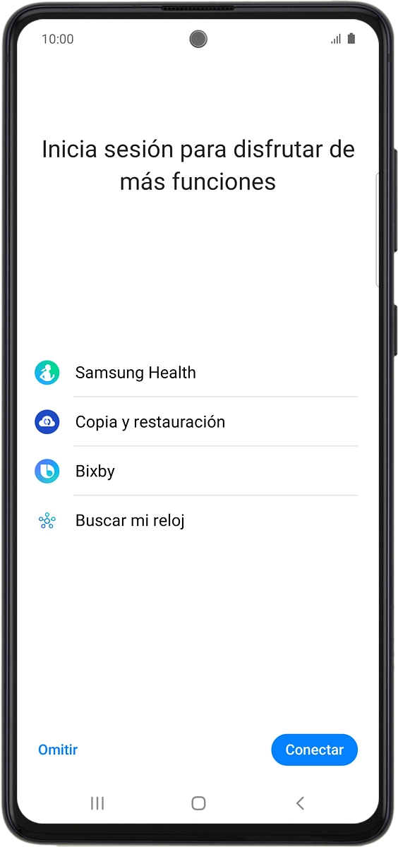 En el teléfono: Pulsa Conectar y sigue las indicaciones de la pantalla para iniciar sesión en tu cuenta de Samsung o para crear una cuenta nueva si todavía no tienes una.