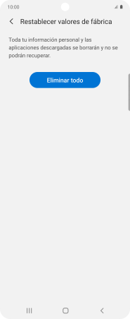Pulsa Eliminar todo. Espera unos instantes mientras el teléfono restablece la configuración predeterminada. Sigue las indicaciones de la pantalla para configurar el teléfono y dejarlo listo para su uso.