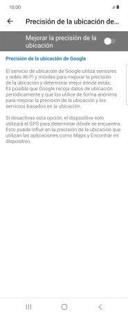 Pulsa el indicador junto a "Mejorar la precisión de la ubicación" para desactivar la función. Si desactivas la función, el teléfono podrá encontrar tu posición exacta con ayuda de los satélites GPS, pero le llevará más tiempo ya que no tiene acceso a informaciones complementarias de la red móvil o una red wifi cercana.