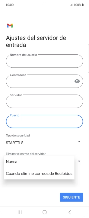 Pulsa Cuando elimine correos de Recibidos para eliminar los correos electrónicos del servidor cuando los borras del teléfono.