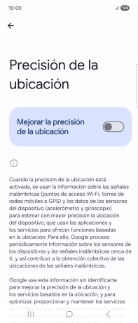 Si pulsas el indicador junto a "Mejorar la precisión de la ubicación" para desactivar la función, el teléfono podrá encontrar tu posición exacta con ayuda de los satélites GPS, pero le llevará más tiempo ya que no tiene acceso a informaciones complementarias de la red móvil o una red wifi cercana.