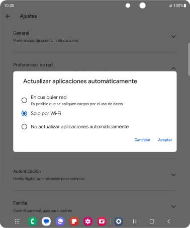 Para activar la actualización automática de apps utilizando la red móvil, pulsa En cualquier red.
