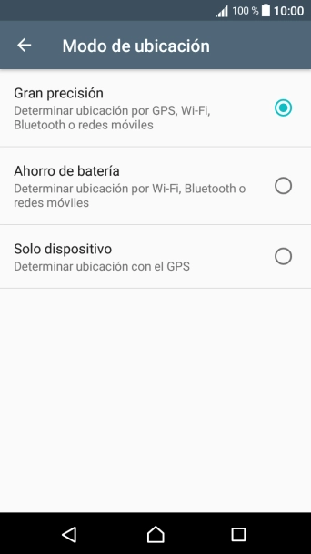 Si seleccionas Solo dispositivo, el teléfono podrá encontrar tu posición exacta con ayuda de los satélites GPS, pero le llevará más tiempo ya que no tiene acceso a informaciones complementarias de la red móvil o una red wifi cercana.