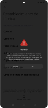 Pulsa OK. Espera unos instantes mientras el teléfono restablece la configuración predeterminada. Sigue las indicaciones de la pantalla para configurar el teléfono y dejarlo listo para su uso.
