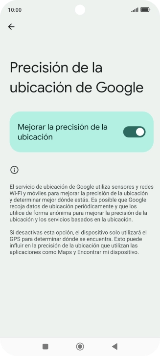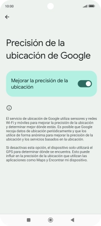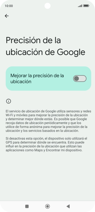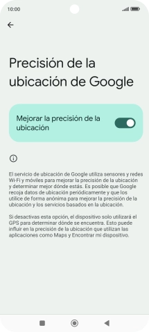 Si pulsas el indicador junto a "Mejorar la precisión de la ubicación" para desactivar la función, el teléfono podrá encontrar tu posición exacta con ayuda de los satélites GPS, pero le llevará más tiempo ya que no tiene acceso a informaciones complementarias de la red móvil o una red wifi cercana.