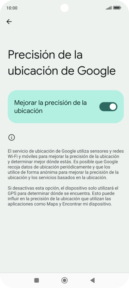 Si pulsas el indicador junto a "Mejorar la precisión de la ubicación" para activar la función, el teléfono podrá encontrar tu posición exacta con ayuda de los satélites GPS, la red móvil y una red wifi cercana. El GPS por satélite requiere vista libre al cielo.