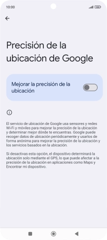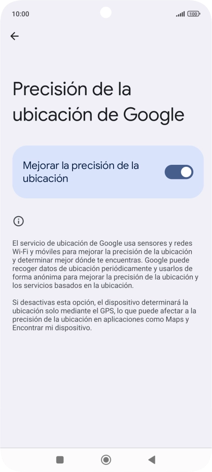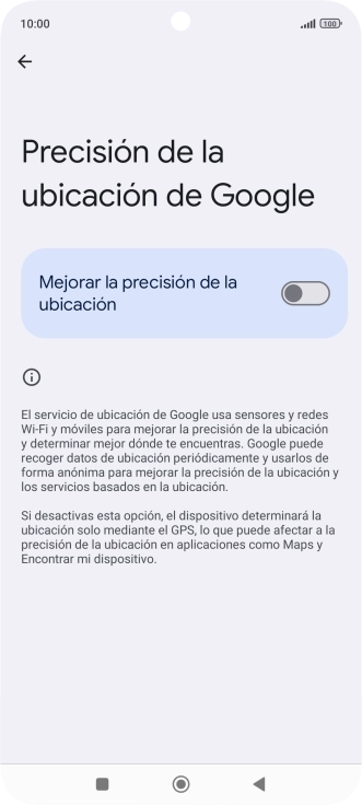 Si pulsas el indicador junto a "Mejorar la precisión de la ubicación" para desactivar la función, el teléfono podrá encontrar tu posición exacta con ayuda de los satélites GPS, pero le llevará más tiempo ya que no tiene acceso a informaciones complementarias de la red móvil o una red wifi cercana.