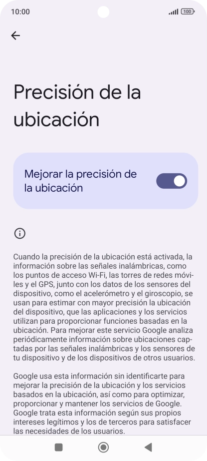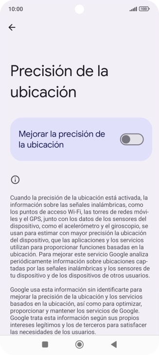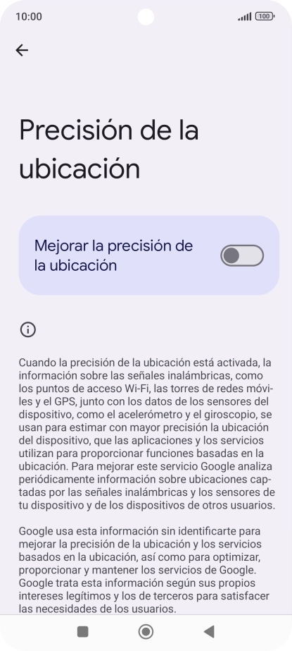 Si pulsas el indicador junto a "Mejorar la precisión de la ubicación" para desactivar la función, el teléfono podrá encontrar tu posición exacta con ayuda de los satélites GPS, pero le llevará más tiempo ya que no tiene acceso a informaciones complementarias de la red móvil o una red wifi cercana.