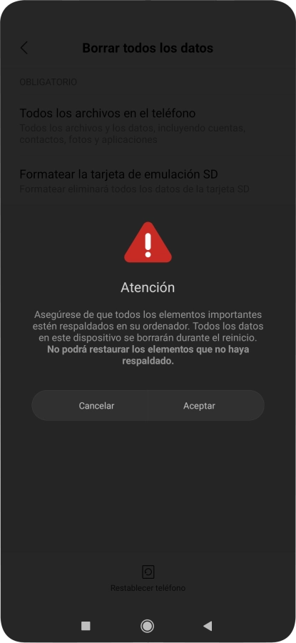 Pulsa Aceptar. Espera unos instantes mientras el teléfono restablece la configuración predeterminada. Sigue las indicaciones de la pantalla para configurar el teléfono y dejarlo listo para su uso.