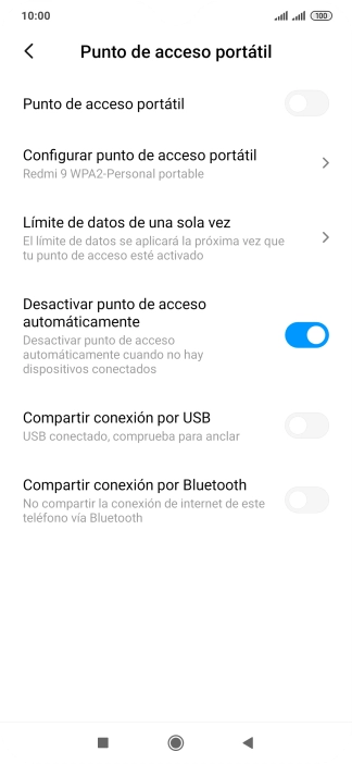 Pulsa el indicador junto a "Punto de acceso portátil" para activar la función.