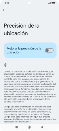 Si pulsas el indicador junto a "Mejorar la precisión de la ubicación" para desactivar la función, el teléfono podrá encontrar tu posición exacta con ayuda de los satélites GPS, pero le llevará más tiempo ya que no tiene acceso a informaciones complementarias de la red móvil o una red wifi cercana.