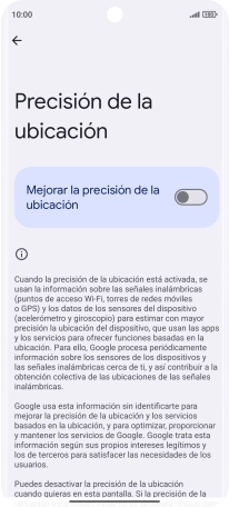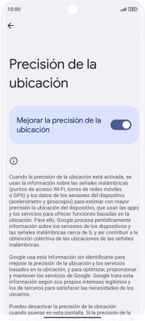 Si pulsas el indicador junto a "Mejorar la precisión de la ubicación" para desactivar la función, el teléfono podrá encontrar tu posición exacta con ayuda de los satélites GPS, pero le llevará más tiempo ya que no tiene acceso a informaciones complementarias de la red móvil o una red wifi cercana.