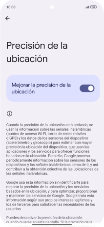 Si pulsas el indicador junto a "Mejorar la precisión de la ubicación" para desactivar la función, el teléfono podrá encontrar tu posición exacta con ayuda de los satélites GPS, pero le llevará más tiempo ya que no tiene acceso a informaciones complementarias de la red móvil o una red wifi cercana.