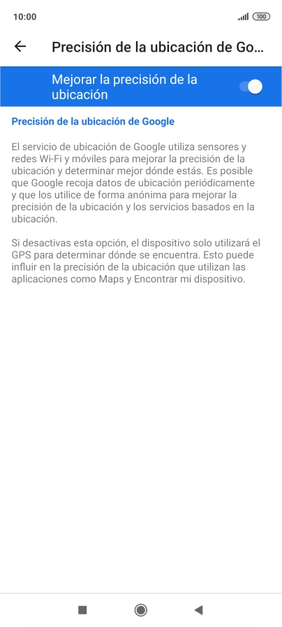 Pulsa el indicador junto a "Mejorar la precisión de la ubicación" para activar la función. Si activas la función, el teléfono podrá encontrar tu posición exacta con ayuda de los satélites GPS, la red móvil y una red wifi cercana. El GPS por satélite requiere vista libre al cielo.