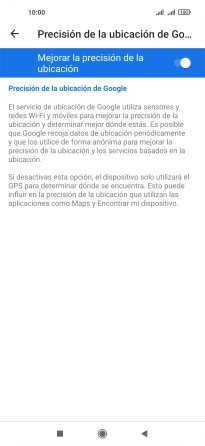 Si pulsas el indicador junto a "Mejorar la precisión de la ubicación" para desactivar la función, el teléfono podrá encontrar tu posición exacta con ayuda de los satélites GPS, pero le llevará más tiempo ya que no tiene acceso a informaciones complementarias de la red móvil o una red wifi cercana.